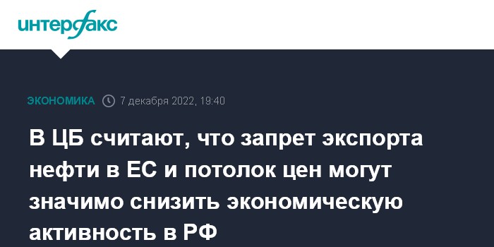 Москва. 7 декабря. INTERFAX.RU - Значимо снизить экономическую активность в РФ могут запрет на экспорт российской нефти в Европу и установка потолка цены на нее, считает департамент исследований и прогнозирования ЦБ РФ.