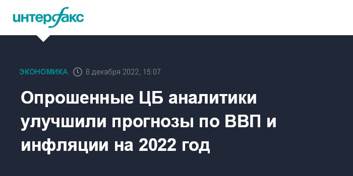Москва. 8 декабря. INTERFAX.RU - В России инфляция в 2022 году может составить 12,3%, а ВВП упасть на 2,9%, считают аналитики, опрошенные Банком России в ходе ежемесячного опроса (опрос проводился 30 ноября - 6 декабря).
