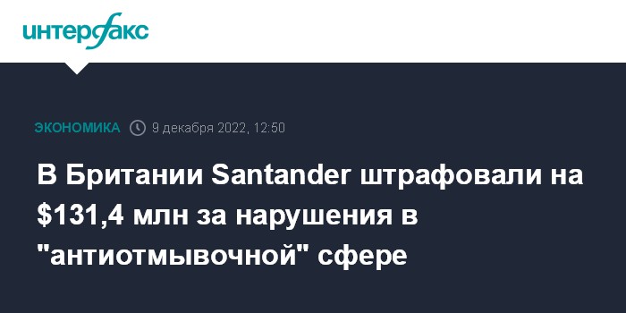 Москва. 9 декабря. INTERFAX.RU - Управление по контролю за соблюдением норм поведения на финансовых рынках (Financial Conduct Authority, FCA) Великобритании оштрафовало британское подразделение крупнейшего банка Испании Banco Santander SA на 107,7 млн фунтов стерлингов ($131,4 млн) за нарушение норм в сфере борьбы с отмыванием денег.