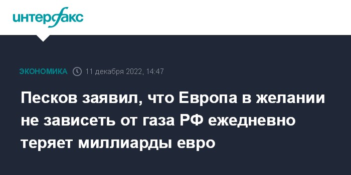 Песков заявил, что Европа в желании не зависеть от газа РФ ежедневно теряет миллиарды евро