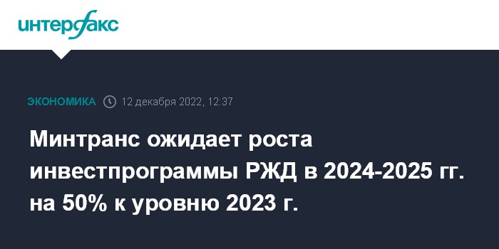 Москва. 12 декабря. INTERFAX.RU - Минтранс РФ ожидает роста инвестпрограммы РЖД в 2024-2025 гг. на 50% к уровню 2023 г., заявил замминистра транспорта Валентин Иванов в ходе круглого стола в Совете Федерации.
