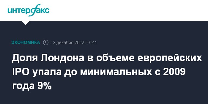 Москва. 12 декабря. INTERFAX.RU - Доля Лондона в общем объеме европейских IPO в 2022 году упала до минимума со времен глобального финансового кризиса, подсчитал Bloomberg.