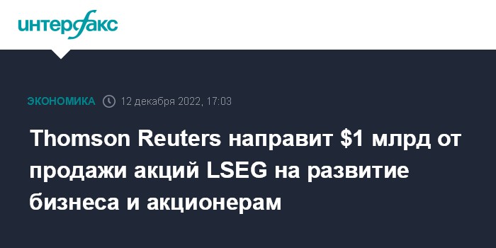Москва. 12 декабря. INTERFAX.RU - Медиакомпания Thomson Reuters Corp. планирует направить порядка $1 млрд, которые получит от продажи акций оператора Лондонской фондовой биржи London Stock Exchange Group Plc американской Microsoft Corp., на выплаты акционерам и развитие бизнеса.