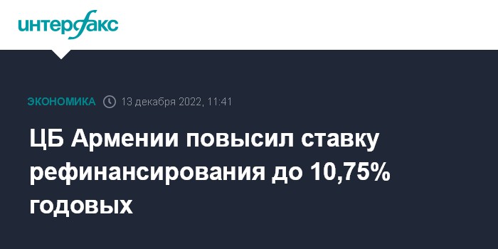 Москва. 13 декабря. INTERFAX.RU - Совет Центрального банка Армении повысил ставку рефинансирования на 25 базисных пунктов, до 10,75% годовых, сообщила пресс-служба регулятора.