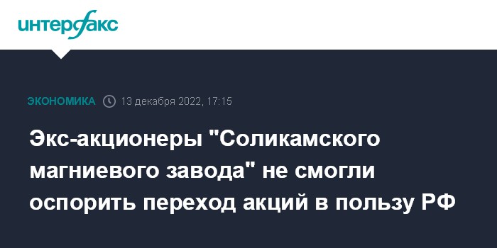 Экс-акционеры "Соликамского магниевого завода" не смогли оспорить переход акций в пользу РФ
