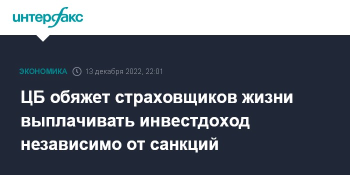 Москва. 13 декабря. INTERFAX.RU - Банк России планирует обязать страховщиков жизни выплачивать дополнительный инвестиционный доход по договорам добровольного страхования жизни независимо от санкций, сообщает регулятор. Такие требования к продуктам инвестиционного и накопительного страхования жизни (ИСЖ и НСЖ) содержатся в опубликованном проекте указания ЦБ, который вносит изменения в действующий порядок.