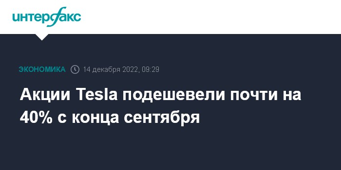 Москва. 14 декабря. INTERFAX.RU - Продолжается падение котировок акций американского производителя электромобилей Tesla, за торги 13 декабря они потеряли 4,1%, с сентября - почти 40%.