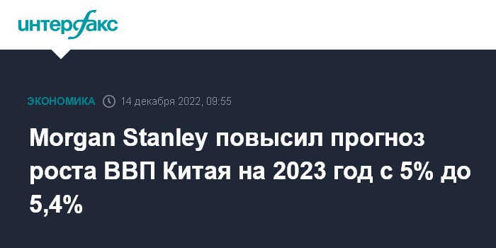 Москва. 14 декабря. INTERFAX.RU - Аналитики Morgan Stanley улучшили прогноз роста ВВП Китая на 2023 год до 5,4% с ожидавшихся ранее 5%, отметив, что быстрое смягчение карантинных ограничений и стимулирующие меры поддержат экономику.