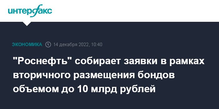 Москва. 14 декабря. INTERFAX.RU - НК "Роснефть" 14 декабря с 11:00 до 15:00 по Москве проведет сбор заявок в рамках вторичного размещения облигаций серий БО-05 и БО-06 в объеме до 10 млрд рублей, сообщил "Интерфаксу" источник на финансовом рынке.