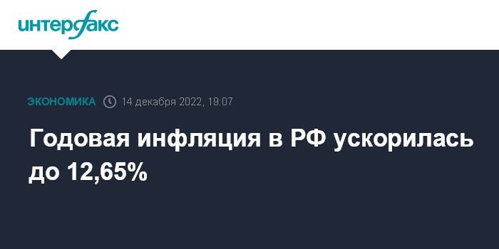 Из среднесуточных данных Росстата за начало декабря этого и прошлого годов следует, что годовая инфляция в РФ ускорилась по состоянию на 12 декабря до 12,65% с примерно 12,5% на 5 декабря и 11,98% на конец ноября.