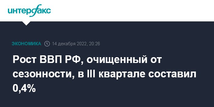 Москва. 14 декабря. INTERFAX.RU - Рост экономики РФ в III квартале 2022 года к предыдущему кварталу с исключением сезонности составил 0,4%, говорится в комментарии Минэкономразвития к оценке ВВП в III квартале.