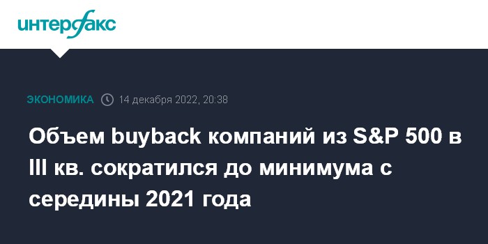 Москва. 14 декабря. INTERFAX.RU - Объем обратного выкупа акций компаний, входящих в расчет индекса S&P 500, в третьем квартале сократился до минимума с середины 2021 года и составил чуть более $200 млрд, согласно подсчетам агентства Bloomberg.