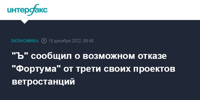Москва. 15 декабря. INTERFAX.RU - ПАО "Фортум" (основной акционер - финский Fortum) может отказаться от части своих самых дешевых проектов ветряных станций (ВЭС), полученных на конкурсе в 2021 году. Речь о проектах суммарной мощностью 459 МВт с запуском в 2025-2027 гг. Об этом пишет в четверг газета "Коммерсантъ" со ссылкой на проект протокола набсовета "Совета рынка".