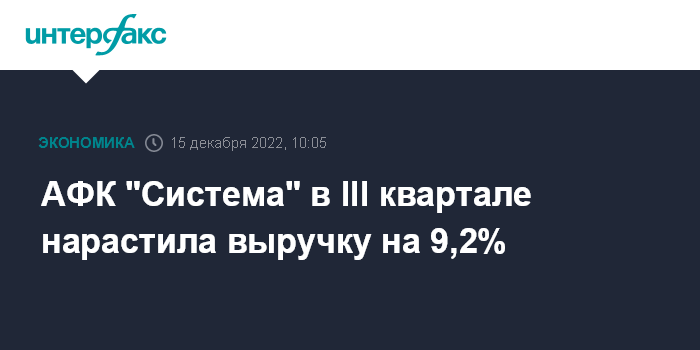 Москва. 15 декабря. INTERFAX.RU - ПАО АФК "Система" по итогам III квартала увеличило выручку на 9,2% год к году, до 239,74 млрд рублей, говорится в отчете компании.
