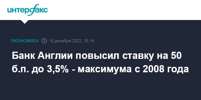 Москва. 15 декабря. INTERFAX.RU - Банк Англии повысил базовую процентную ставку до 3,5% с 3% годовых, как и ожидало большинство аналитиков. Ставка была повышена по итогам девятого заседания подряд и достигла максимального значения за 14 лет, отмечает Bloomberg.
