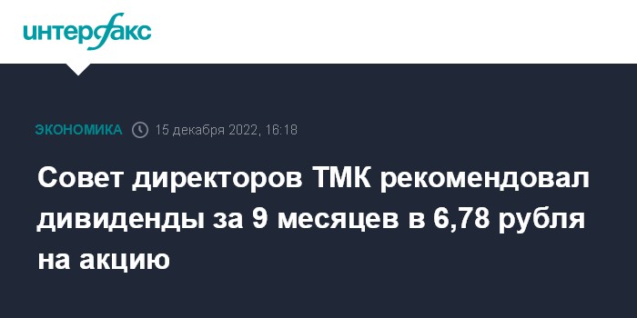 Москва. 15 декабря. INTERFAX.RU - Совет директоров ПАО "Трубная металлургическая компания" (ТМК) рекомендовал выплатить дивиденды по итогам 9 месяцев 2022 года в размере 6,78 рубля на акцию, сообщила компания. Общая сумма выплат может составить 7 млрд рублей.