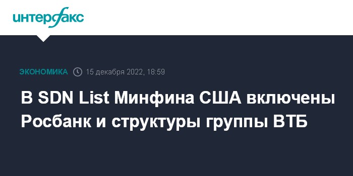 Москва. 15 декабря. INTERFAX.RU - Минфин США включил в SDN List Росбанк, сообщил администратор санкционного списка OFAC.