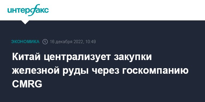 Москва. 16 декабря. INTERFAX.RU - Власти Китая готовятся централизовать закупки железной руды для сталелитейных компаний с помощью госкомпании China Mineral Resources Group (CMRG) в 2023 году, сообщает Bloomberg со ссылкой на источники.