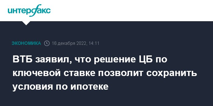 Москва. 16 декабря. INTERFAX.RU - Решение Банка России оставить ключевую ставку на уровне 7,5% годовых позволит сохранить текущие условия по ипотеке, прокомментировали пятничное решение ЦБ в пресс-службе ВТБ.