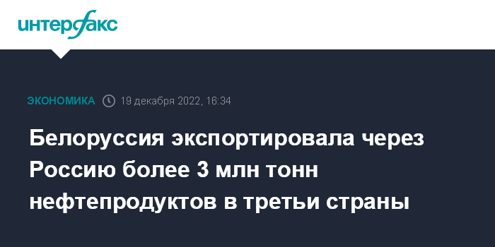 Москва. 19 декабря. INTERFAX.RU - В 2022 году экспорт белорусских нефтепродуктов в третьи страны через территорию России уже превысил 3 млн т, сообщил на сессии Парламентского собрания Союза Белоруссии и России в Москве министр экономического развития России Максим Решетников.
