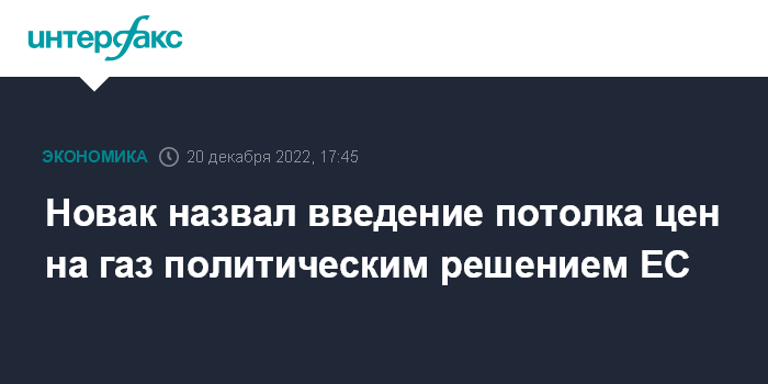 Москва. 20 декабря. INTERFAX.RU - Введение Евросоюзом потолка цен на газ - это политическое решение, а не экономический инструмент, заявил журналистам вице-премьер Александр Новак.