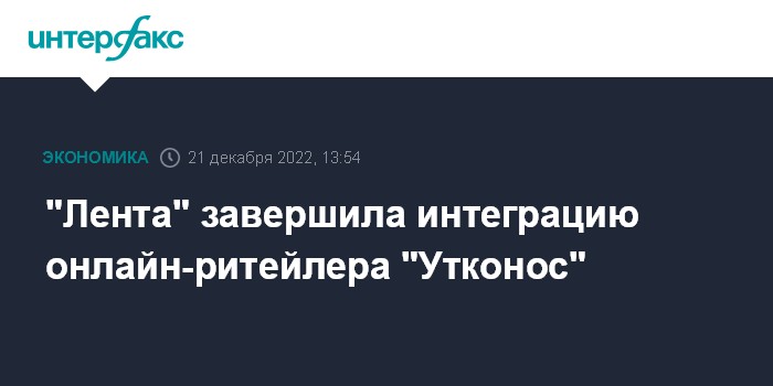 Москва. 21 декабря. INTERFAX.RU - Торговая сеть "Лента" завершила реорганизацию в форме присоединения ООО "Новый Импульс-50" (операционная структура онлайн-ритейлера "Утконос"), свидетельствуют данные ЕГРЮЛ. Соответствующие записи в ЕГРЮЛ были внесены 19 декабря.
