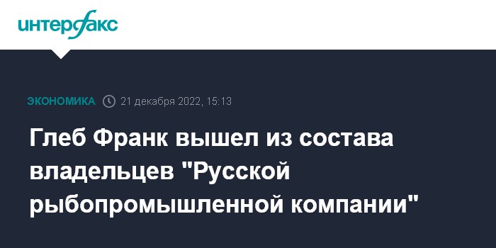Москва. 21 декабря. INTERFAX.RU - Глеб Франк, подпавший под санкции США, вышел из состава владельцев "Русской рыбопромышленной компании" (РРПК), следует из данных ЕГРЮЛ.