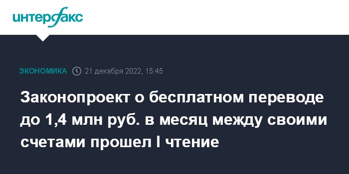Законопроект о бесплатном переводе до 1,4 млн руб. в месяц между своими счетами прошел I чтение
