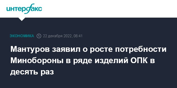 Москва. 22 декабря. INTERFAX.RU - Министерство обороны РФ поставило в 2022 году задачу увеличить в десять раз выпуск ряда образцов продукции, необходимой для решения задач специальной военной операции (СВО), сообщил заместитель председателя правительства, министр промышленности и торговли РФ Денис Мантуров.