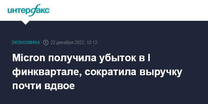 Москва. 22 декабря. INTERFAX.RU - Американский производитель чипов памяти Micron Technology зафиксировал чистый убыток в первом финансовом квартале 2023 года и резко сократил выручку.