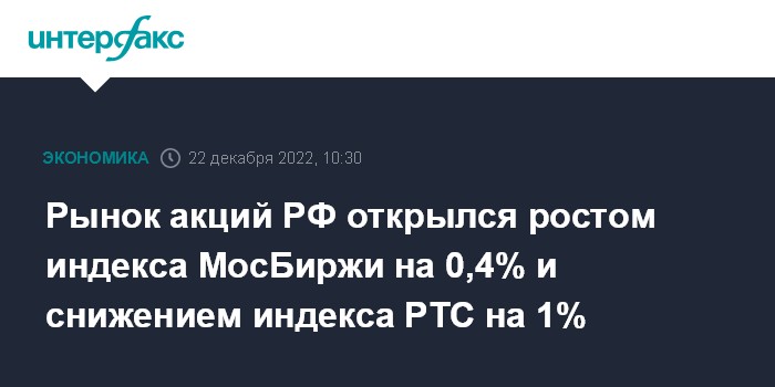 Рынок акций РФ открылся ростом индекса МосБиржи на 0,4% и снижением индекса РТС на 1%