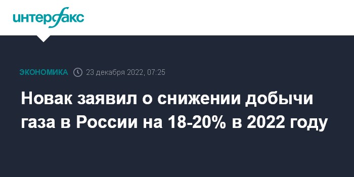 Москва. 23 декабря. INTERFAX.RU - Добыча природного газа в России в 2022 году снизится на 18-20% - до 671 млрд куб. м, сообщил в интервью телеканалу "Россия 24" (ВГТРК) вице-премьер РФ Александр Новак.