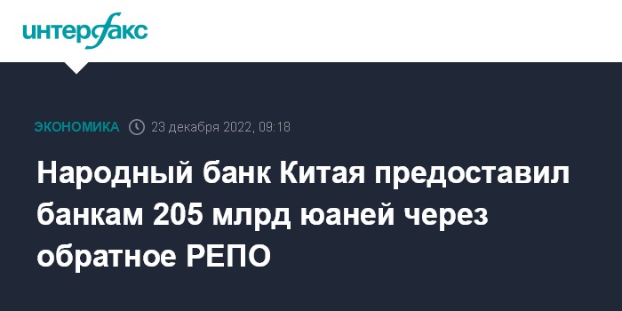 Москва. 23 декабря. INTERFAX.RU - Народный банк Китая 23 декабря предоставил банкам 205 млрд юаней ($29,4 млрд) в рамках операций обратного РЕПО.