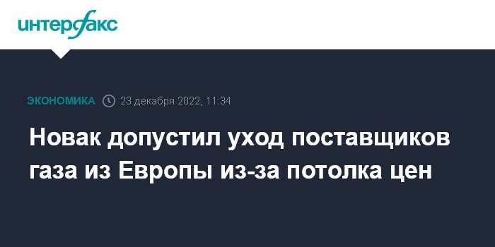 Москва. 23 декабря. INTERFAX.RU - Вице-премьер Александр Новак полагает, что из-за введения потолка цен на газ европейском рынке поставщики газа могут перейти на другие площадки, где нет таких ограничений. Он сказал это телеканалу "Россия 24".