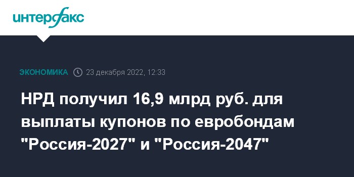 НРД получил 16,9 млрд руб. для выплаты купонов по евробондам "Россия-2027" и "Россия-2047"