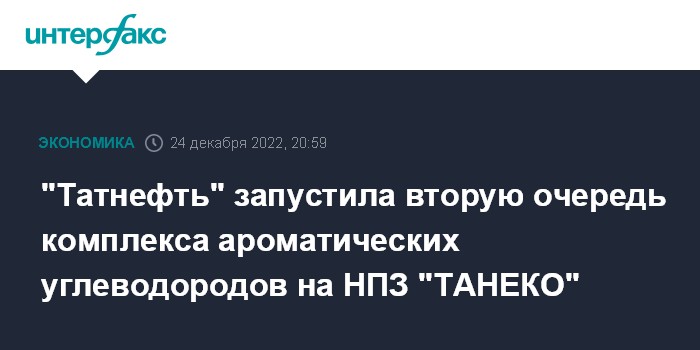 Москва. 24 декабря. INTERFAX.RU - На нефтекомплексе АО "ТАНЕКО" (входит в "Татнефть") в субботу состоялся пуск второй очереди комплекса ароматических углеводородов (КПА-2) в режиме комплексного опробования, сообщила пресс-служба "Татнефти".