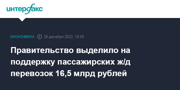 Москва. 26 декабря. INTERFAX.RU - Правительство выделило из резервного фонда 16,5 млрд рублей на субсидирование скидок владельцам железнодорожной инфраструктуры для пассажирских перевозок. Такое распоряжение подписал премьер-министр Михаил Мишустин, сообщает сайт правительства.