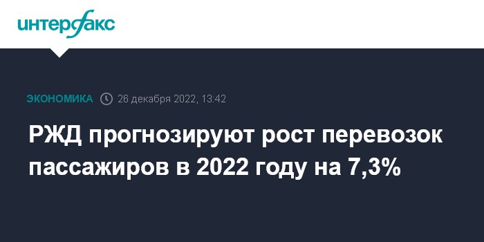 Москва. 26 декабря. INTERFAX.RU - Перевозки пассажиров на сети ОАО "РЖД" 2022 году вырастут до 1,13 млрд человек, сообщил замглавы монополии Дмитрий Пегов. Это означает увеличение перевозок на 7,3%.