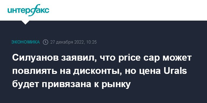 Москва. 27 декабря. INTERFAX.RU - Потолок цен на российскую нефть может повлиять на дисконты к Brent, с которыми реализуется покупателям смесь Urals, но ее цена все равно будет привязана к рыночным условиям, а не к параметрам price cap, заявил глава Минфина Антон Силуанов.