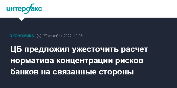 Москва. 27 декабря. INTERFAX.RU - Банк России предлагает ужесточить расчет норматива концентрации рисков на связанные стороны (Н25), максимально приблизив его к принципам МСФО, говорится в докладе регулятора о перспективных направлениях развития банковского регулирования и надзора.