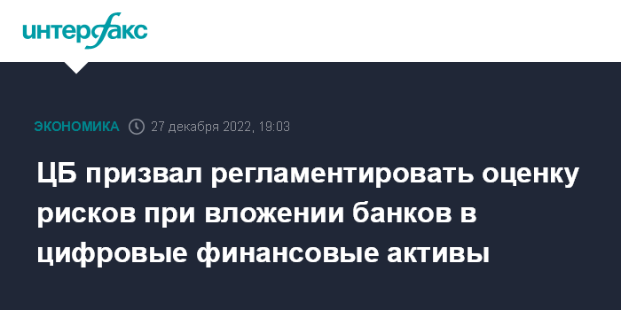 Москва. 27 декабря. INTERFAX.RU - Банк России предлагает начать учитывать в регулировании как риски вложения кредитных организаций в цифровые финансовые активы (ЦФА), так и привлечение банками инвестиций посредством выпуска цифровых прав. Это следует из доклада ЦБ "Перспективные направления развития банковского регулирования и надзора".