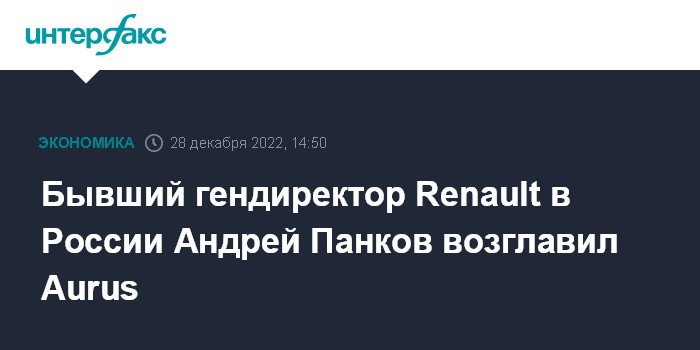 Москва. 28 декабря. INTERFAX.RU - Бывший гендиректор российского представительства Renault Андрей Панков назначен главой бренда Aurus (ООО "Аурус", ООО "Аурус Моторс"), сообщила пресс-служба компании.