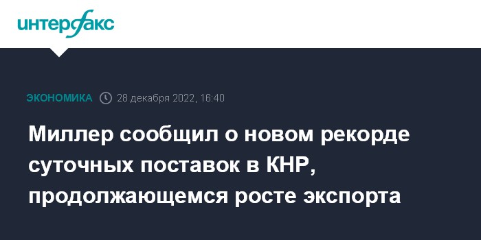 Председатель правления концерна Алексей Миллер на предновогоднем селекторном совещании заявил: "Мы приняли решение, что в декабре 2022 года будем поставлять газ в Китай с превышением суточных контрактных обязательств. Максимальное превышение составило 18,7%. И вот сегодня будет установлен еще один новый рекорд суточных поставок в Китай".