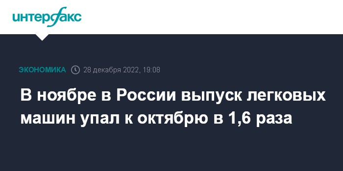 Москва. 28 декабря. INTERFAX.RU - В ноябре 2022 года производство легковых автомобилей в России сократилось к октябрю в 1,6 раза (на 36,5%), до 23,7 тысячи единиц, вернувшись к помесячному снижению после октябрьского всплеска, следует из данных Росстата.