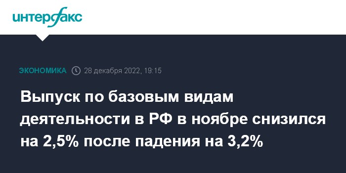 Выпуск по базовым видам деятельности в РФ в ноябре снизился на 2,5% после падения на 3,2%
