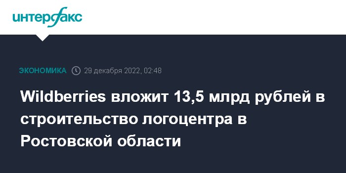 Москва. 29 декабря. INTERFAX.RU - Онлайн-ритейлер Wildberries планирует вложить 13,5 млрд рублей в строительство логистического центра в Ростовской области, сообщил губернатор региона Василий Голубев в своем телеграм-канале.