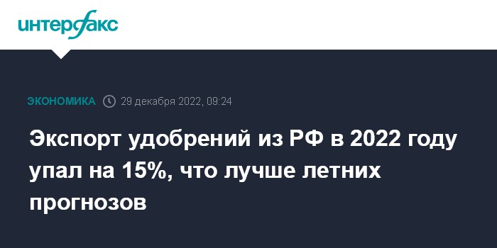 Москва. 29 декабря. INTERFAX.RU - Экспорт удобрений из России в 2022 году сократился на 15% - это лучше, чем прогнозировалось в середине года, сообщил президент Российской ассоциации производителей удобрений (РАПУ) Андрей Гурьев.