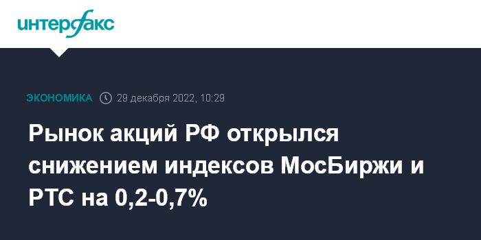 Москва. 29 декабря. INTERFAX.RU - Рынок акций РФ открылся в четверг снижением большинства blue chips на фоне ухудшения внешней фондовой и нефтяной конъюнктуры на опасениях относительно мировой рецессии и роста заболеваемости COVID-19 в Китае; индексы МосБиржи и РТС за минуту торгов просели на 0,2-0,7%, при этом упали на 11% акции "Газпром нефти" после отсечки на бирже дивидендов за 9 месяцев.