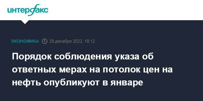 Москва. 29 декабря. INTERFAX.RU - Порядок соблюдения и реализации указа президента РФ об ответных мерах на введение потолка цен на российские нефть и нефтепродукты будет опубликован сразу после новогодних праздников, сообщил журналистам вице-премьер Александр Новак.