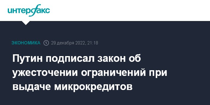 Москва. 29 декабря. INTERFAX.RU - Президент Владимир Путин подписал закон, ужесточающий для микрофинансовых организаций (МФО) нормативы выдачи кредитов гражданам. Закон опубликован на официальном портале правовой информации и вступит в силу 1 июля 2023 года.